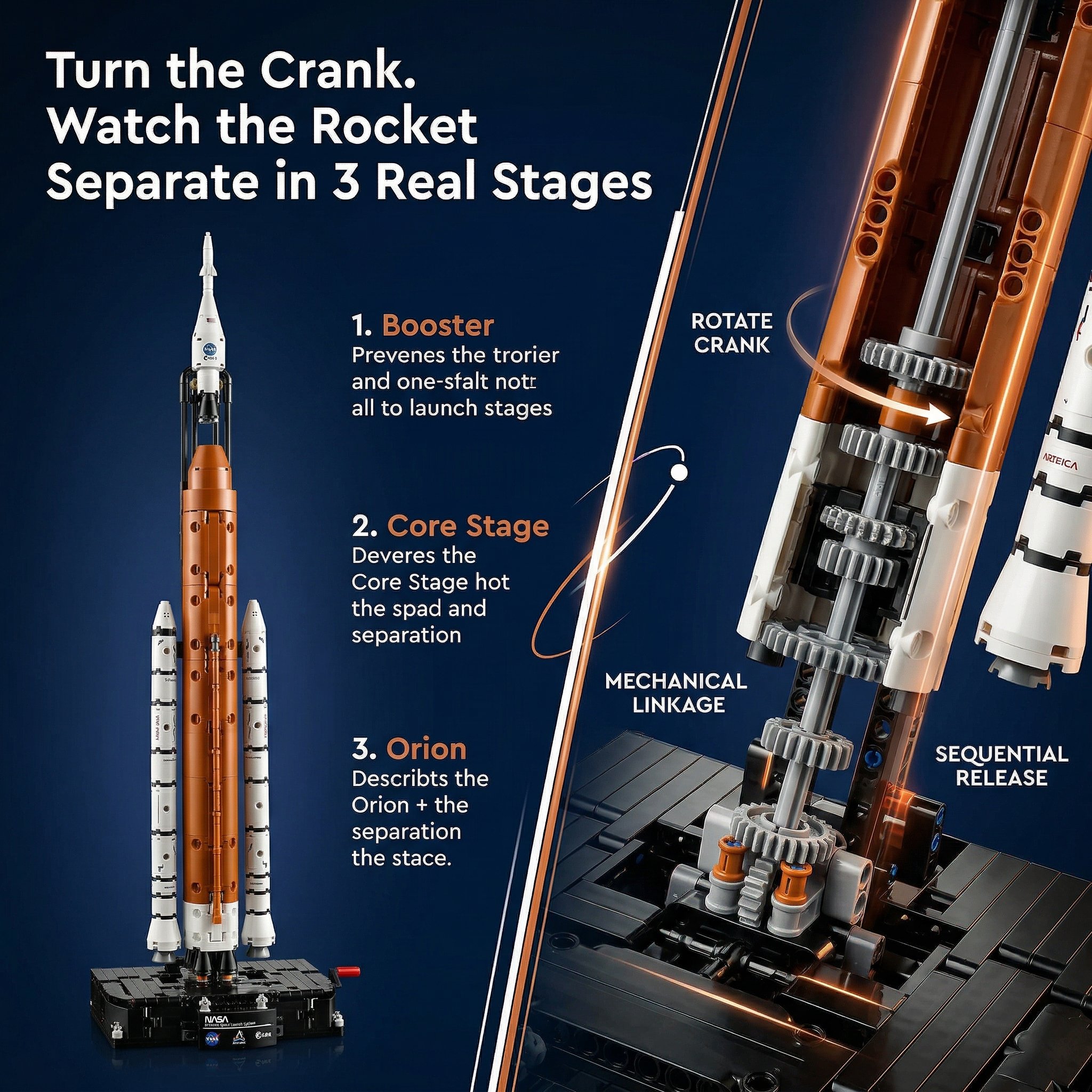 Turn the hand crank to watch the rocket separate in 3 realistic stages: solid rocket boosters, core stage, and upper stage with Orion spacecraft. Kids can relive the thrill of a real launch, learning about rocket physics through hands-on play.